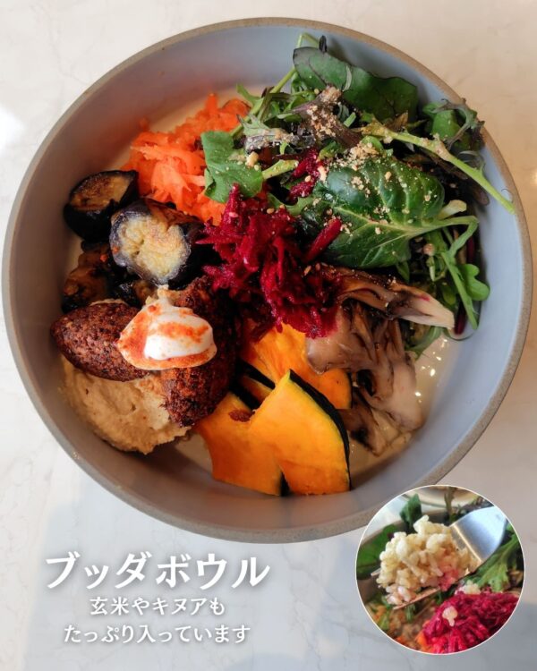ブッダボウルは見た目も鮮やかで気分があがります😆ベースに玄米とキヌアとたっぷり入っているので見た目以上に食べ応えがあります✨中でもお店で1つ1つ手作りしているファラフェルは何度もレシピを見直して完成した拘りの1品だそう。サクサク食感と優しいけどスパイスの効いた味わいがたまらない美味しさでした😋