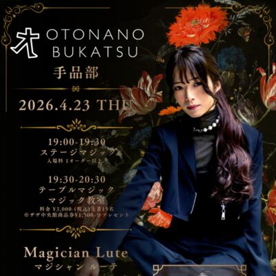 オトナのブカツ第3弾の「手品部」~マジシャン ルーテさんによるマジックショー~を4月23日に開催を予定しています。プロマジシャン ルーテさんをお招きし、テーブルマジックを楽しんでいただけるイベントです。カードやコインが目の前で消える、現れる…。距離が近いからこそ驚きが倍増する「テーブルマジック」の世界をぜひ体験しに来てください。お待ちしております!